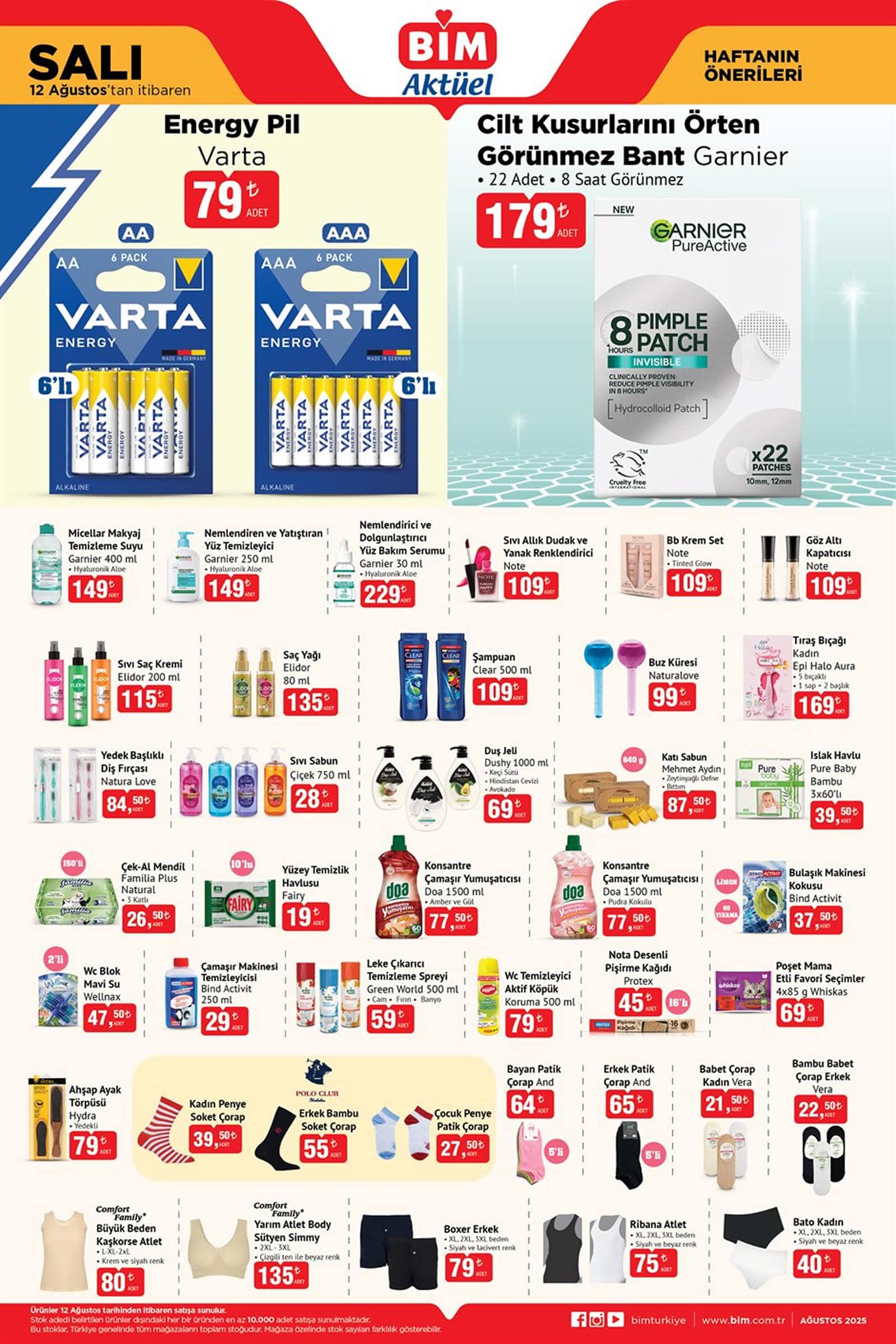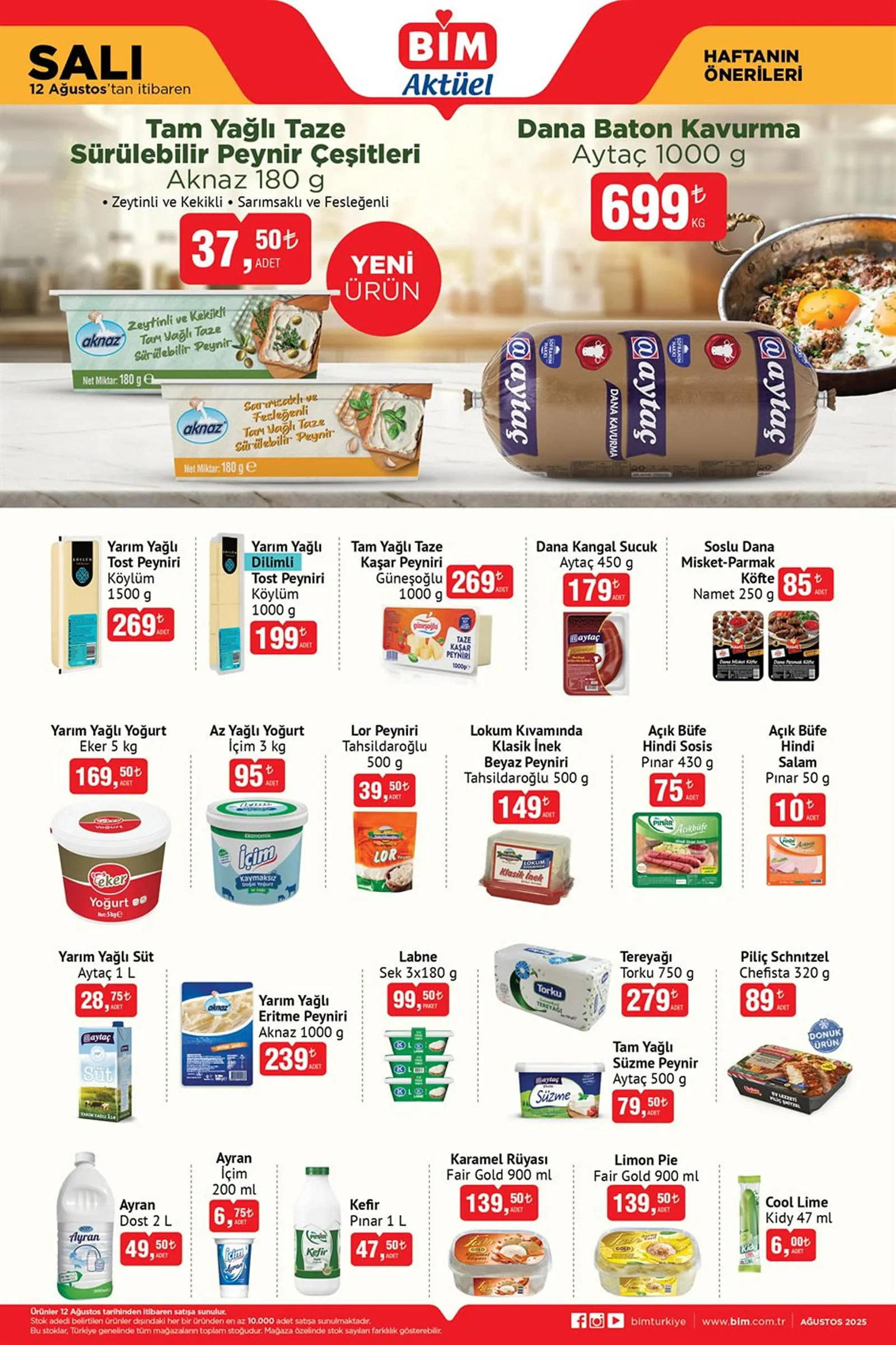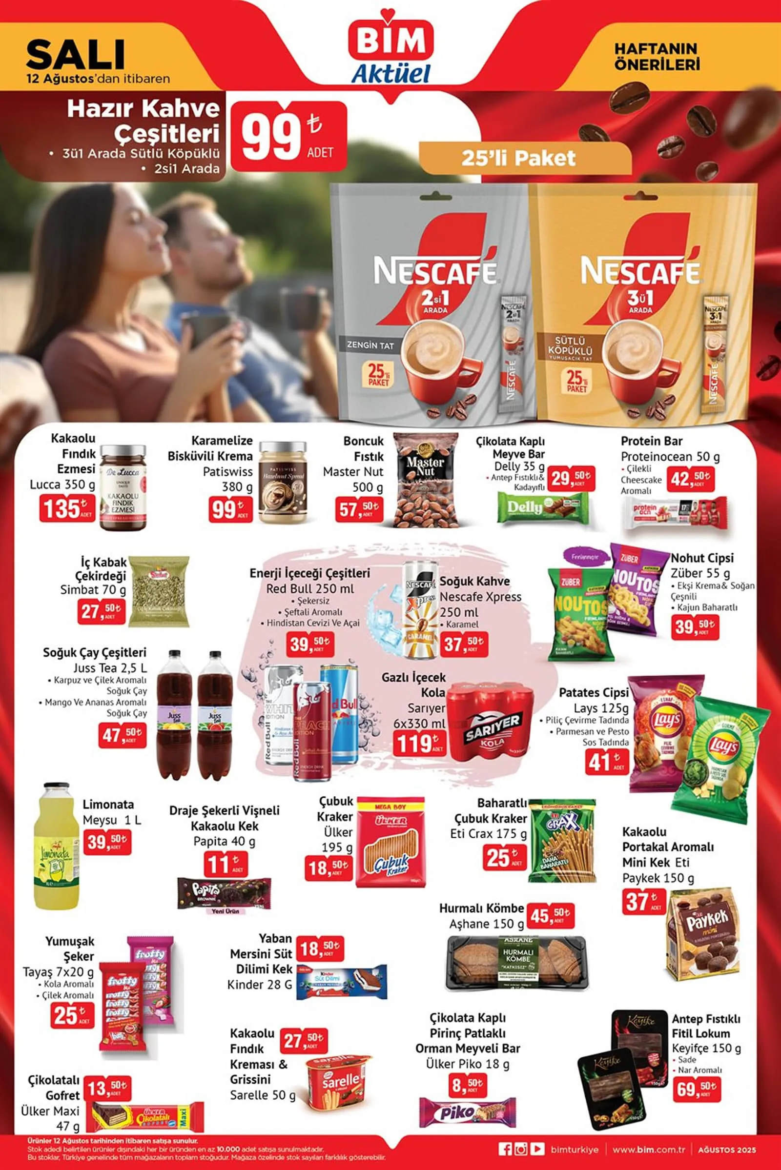 İç kabak çekirdeği, boncuk fıstık, karamelize bisküvili krema, enerji içeceği çeşitleri, soğuk kahve, nohut cipsi, kola, patates cipsi, kraker, limonata, yumuşak şeker, yaban mersinli süt dilimi kek, hurmalı kömbe, çikolata kaplı pirinç patlaklı orman meyveli bar ve çikolatalı gofret gibi ürünlerin yer aldığı 12 Ağustos tarihinden itibaren geçerli olacak BİM kataloğu yayınlandı.